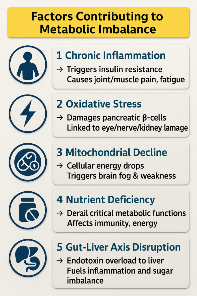 DIABETEM Metabolic Support Are they diseases — or just the body’s warning signs? DIABETEM When Metabolism goes off balance, It doesn’t just raise blood sugar — it affects your whole body; Controlling blood sugar is only part of the story.Fatigue, slow healing, pain, and therapy resistance often come from breakdown in five core systems — the pillars that keepMetabolism working Addressing these underlying factors is just as important aslowering blood sugar.